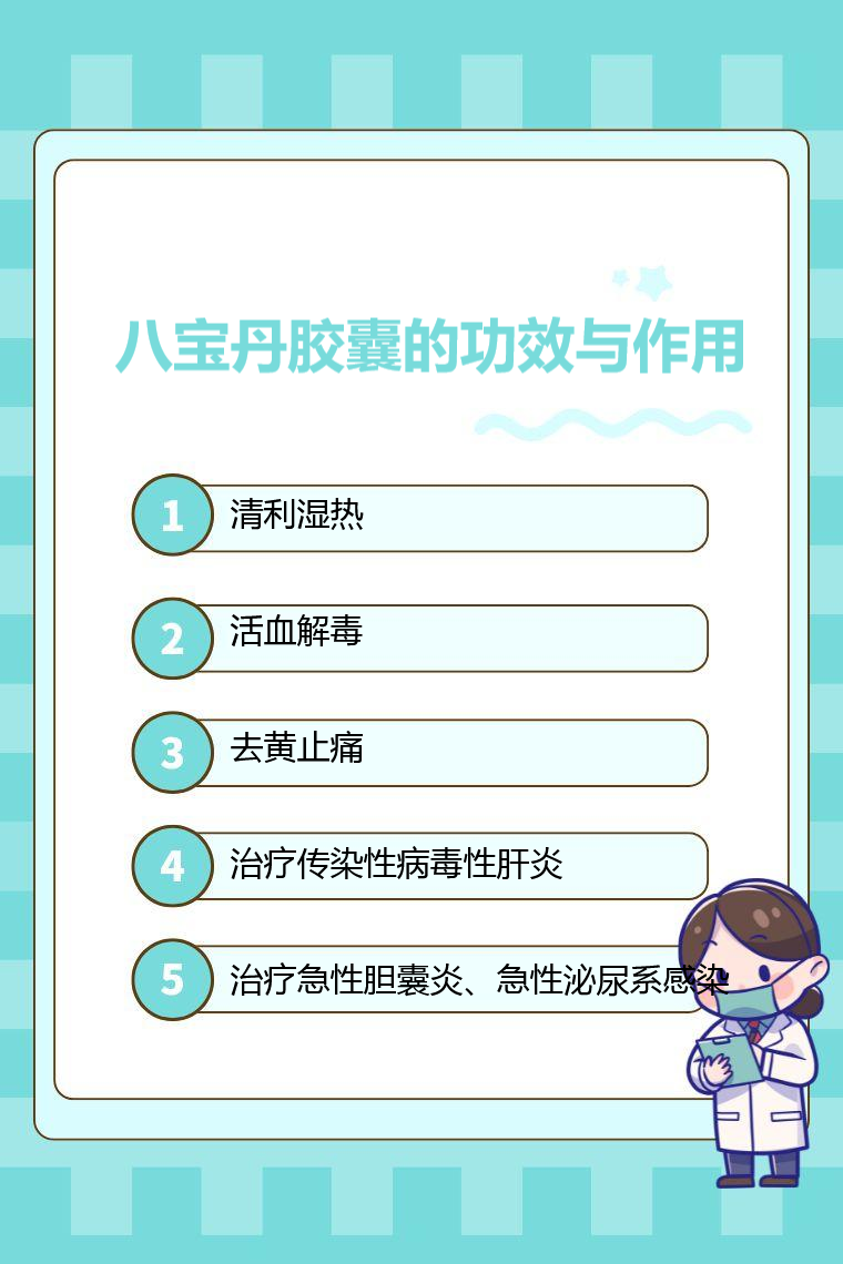 八宝丹胶囊具有清利湿热、活血解毒、去黄止痛等作用,可用于湿热蕴结所致发热、黄疸、小便黄赤、恶心呕吐、纳呆、胁痛腹胀、舌苔黄腻或厚腻干白或湿热下注所致尿道灼热刺痛、小腹胀痛,以及传染性病毒性肝炎、急性胆囊炎、急性泌尿系感染等见有上述证候者。