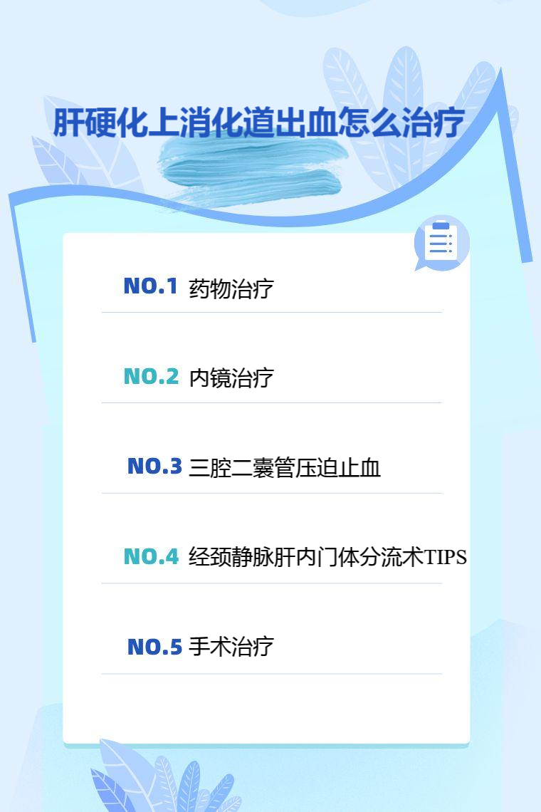 肝硬化上消化道出血的治疗方法主要包括药物治疗、内镜治疗、三腔二囊管压迫止血、经颈静脉肝内门体分流术TIPS以及手术治疗等。