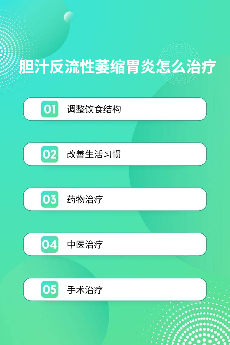 胆汁反流性萎缩胃炎的治疗方法主要包括调整饮食结构、改善生活习惯、药物治疗、中医治疗、手术治疗等。