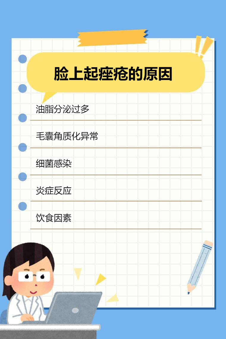 脸上起痤疮的原因较为复杂,包括油脂分泌过多、毛囊角质化异常、细菌感染、炎症反应、饮食因素等。