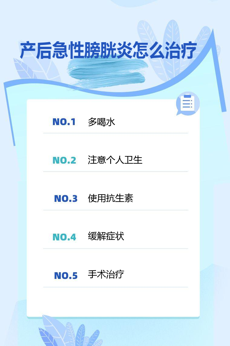 产后急性膀胱炎的治疗方法主要包括多喝水、注意个人卫生、使用抗生素、缓解症状以及必要时的手术治疗等。