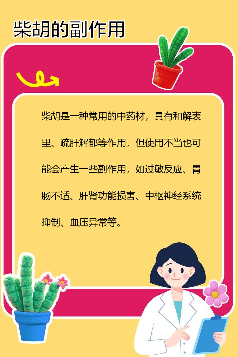 柴胡是一种常用的中药材,具有和解表里、疏肝解郁等作用,但使用不当也可能会产生一些副作用,如过敏反应、胃肠不适、肝肾功能损害、中枢神经系统抑制、血压异常等。