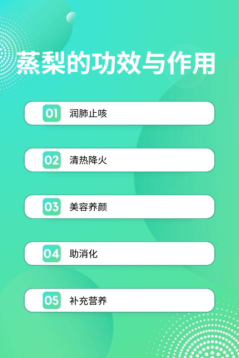 1.润肺止咳:蒸梨中的水分和营养成分有助于缓解呼吸道炎症,减轻咳嗽症状,尤其对肺热咳嗽有一定的缓解作用。