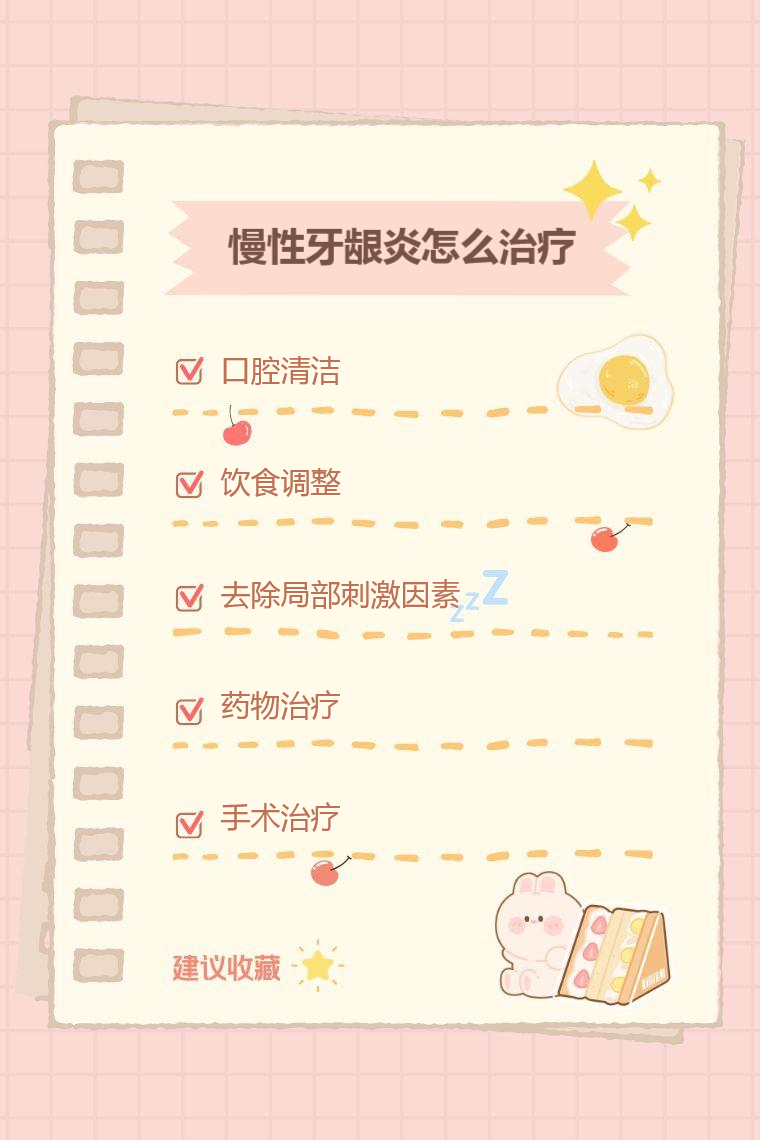 慢性牙龈炎是一种常见的口腔疾病,可通过口腔清洁、饮食调整、去除局部刺激因素、药物治疗、手术治疗等方式。