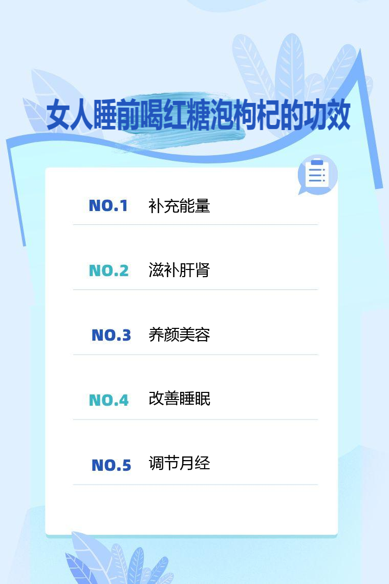 2.滋补肝肾:枸杞具有滋补肝肾的功效。对于女性来说,肝肾的健康对于维持身体的正常功能和内分泌平衡非常重要。睡前喝红糖泡枸杞可以起到滋养肝肾的作用,有助于提高身体的免疫力和抵抗力。