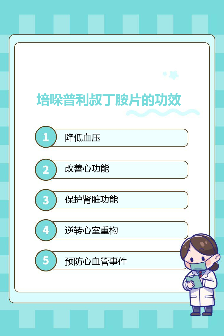 1.降低血压:培哚普利叔丁胺片通过抑制血管紧张素转换酶,减少血管紧张素Ⅱ的生成,从而扩张血管,降低血压。适用于各种类型的高血压患者,尤其是合并有糖尿病、肾病等并发症的患者。