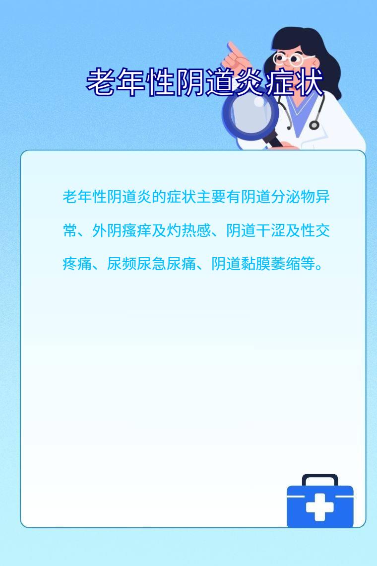 老年性阴道炎的症状主要有阴道分泌物异常、外阴瘙痒及灼热感、阴道干涩及性交疼痛、尿频尿急尿痛、阴道黏膜萎缩等。