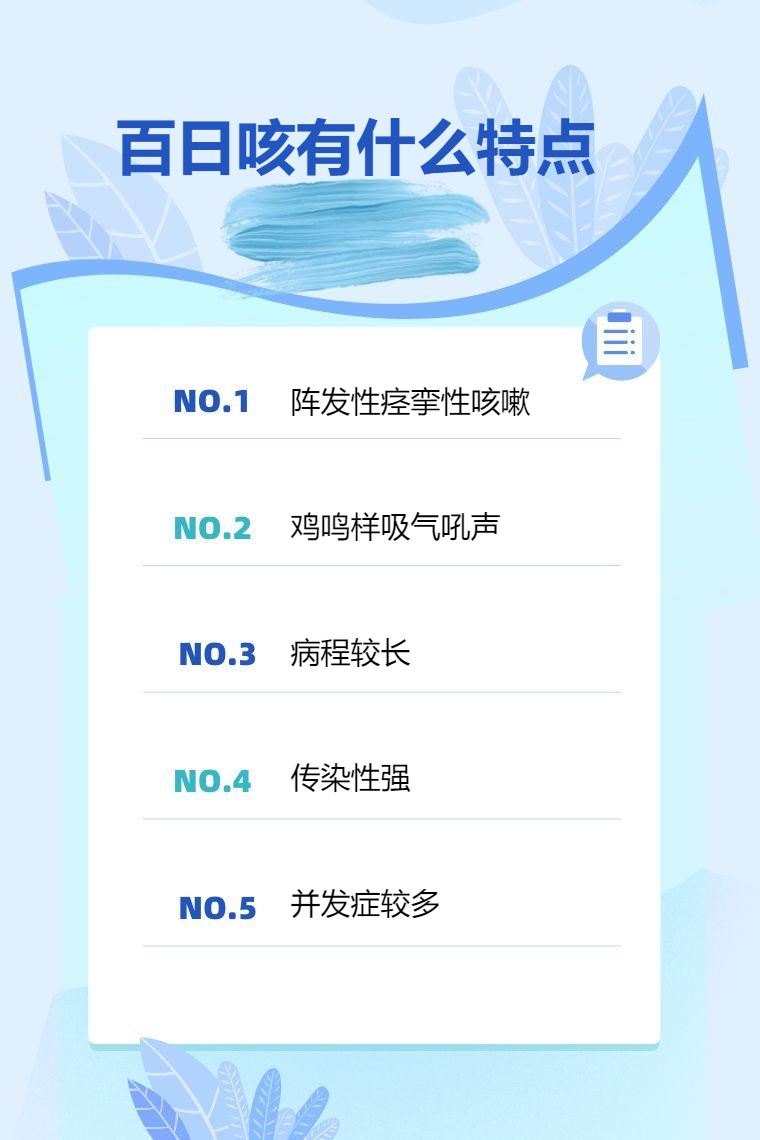 百日咳是一种由百日咳杆菌引起的急性呼吸道传染病,其特点包括阵发性痉挛性咳嗽、鸡鸣样吸气吼声、病程较长、传染性强、并发症较多等。