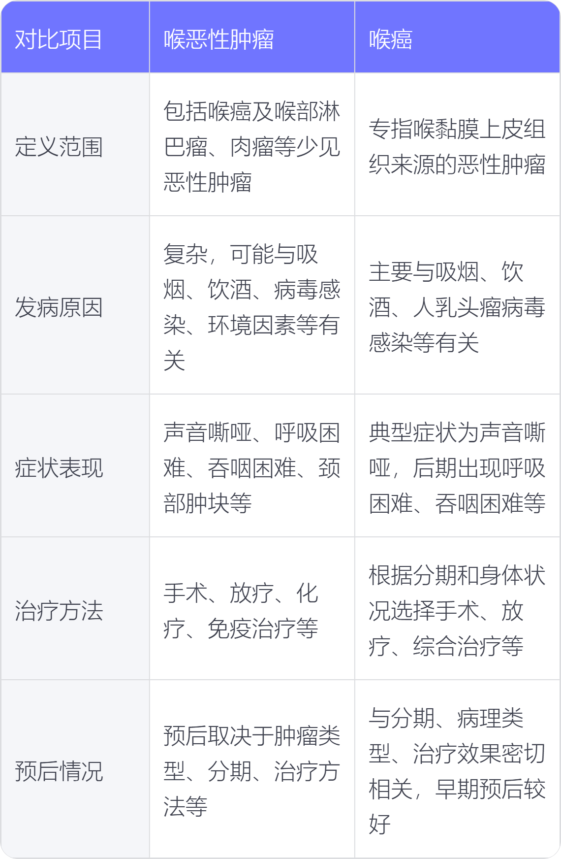 1.定义范围:喉恶性肿瘤包括喉癌以及其他少见的恶性肿瘤,如喉部淋巴瘤、肉瘤等;喉癌则是来源于喉黏膜上皮组织的恶性肿瘤。