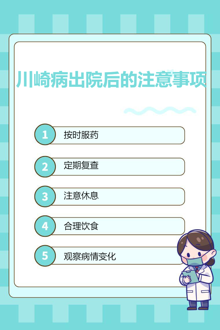 川崎病出院后的注意事项包括按时服药、定期复查、注意休息、合理饮食、观察病情变化等。