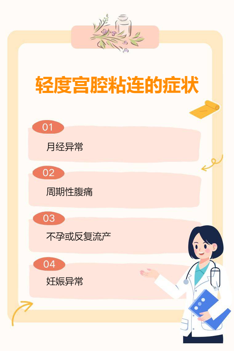 轻度宫腔粘连的症状包括月经异常、周期性腹痛、不孕或反复流产、妊娠异常等。