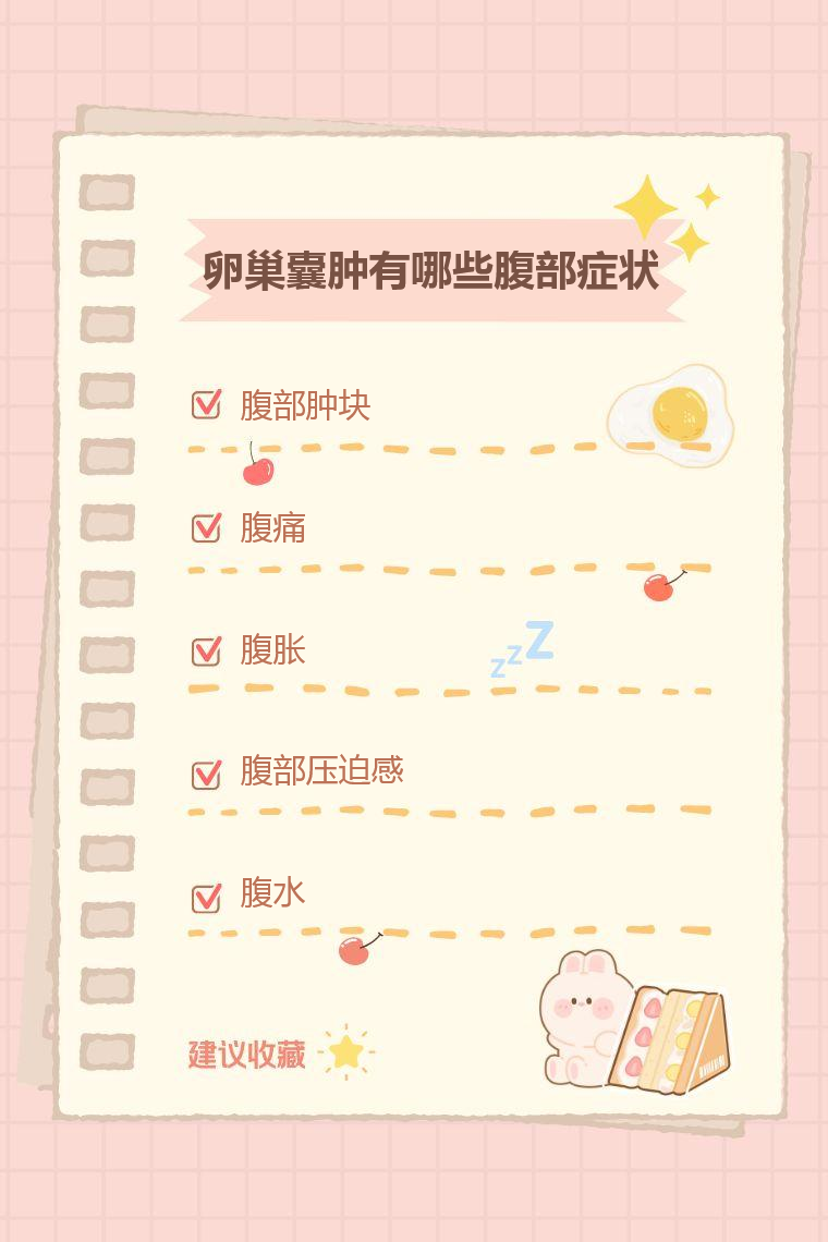 卵巢囊肿的腹部症状包括腹部肿块、腹痛、腹胀、腹部压迫感、腹水等。