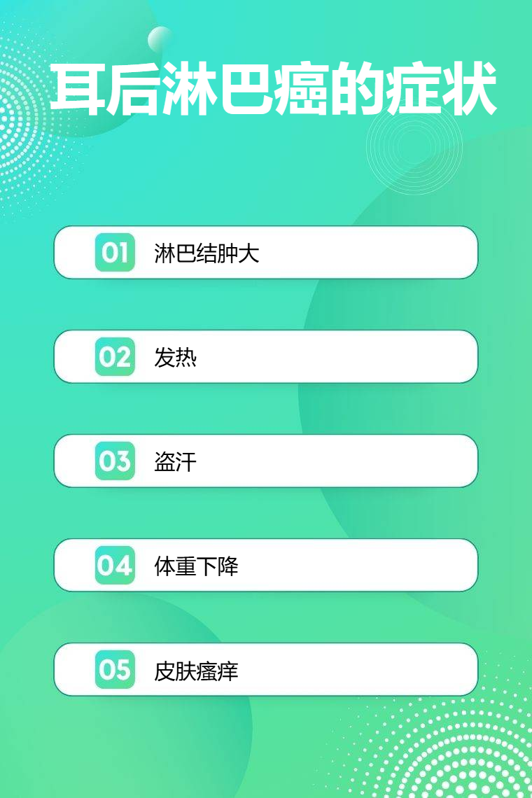 耳后淋巴癌的症状包括淋巴结肿大、发热、盗汗、体重下降、皮肤瘙痒等。