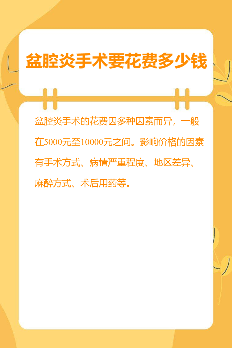 盆腔炎手术的花费因多种因素而异,一般在5000元至10000元之间。影响价格的因素有手术方式、病情严重程度、地区差异、麻醉方式、术后用药等。