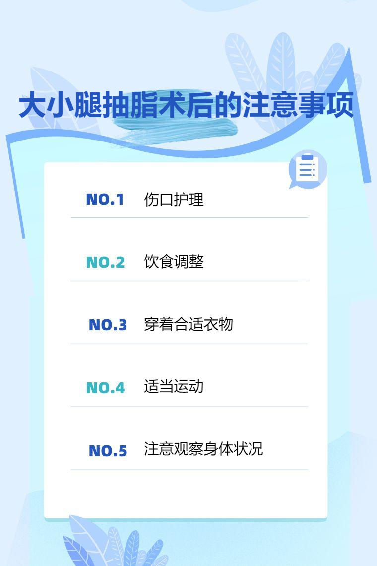 大小腿抽脂术后需要注意伤口护理、饮食调整、穿着合适衣物、适当运动以及注意观察身体状况等。