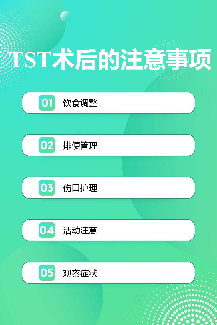 TST 术后的注意事项包括饮食调整、排便管理、伤口护理、活动注意、观察症状等。