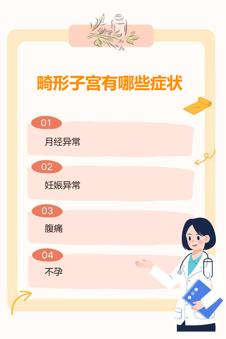 畸形子宫的症状包括月经异常、妊娠异常、腹痛、不孕等。
