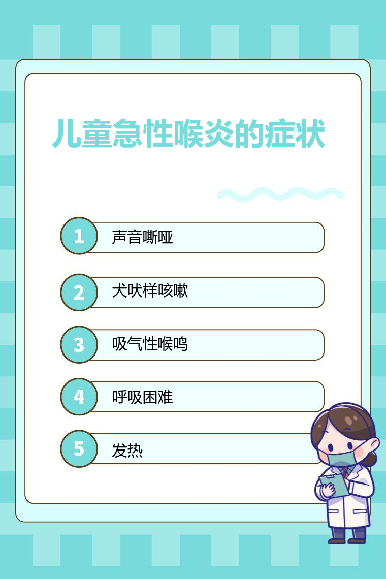 儿童急性喉炎的症状包括声音嘶哑、犬吠样咳嗽、吸气性喉鸣、呼吸困难、发热等。