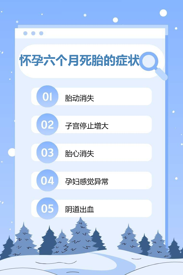 怀孕六个月时,死胎可能出现的症状有胎动消失、子宫停止增大、胎心消失、孕妇感觉异常、阴道出血等。