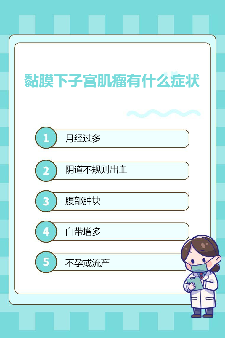 黏膜下子宫肌瘤的症状包括月经过多、阴道不规则出血、腹部肿块、白带增多、不孕或流产等。