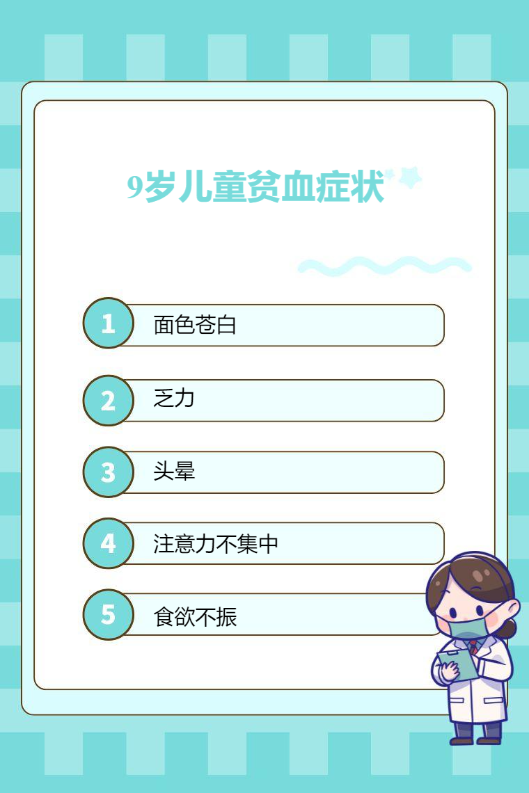 9 岁儿童贫血可能出现面色苍白、乏力、头晕、注意力不集中、食欲不振等症状。