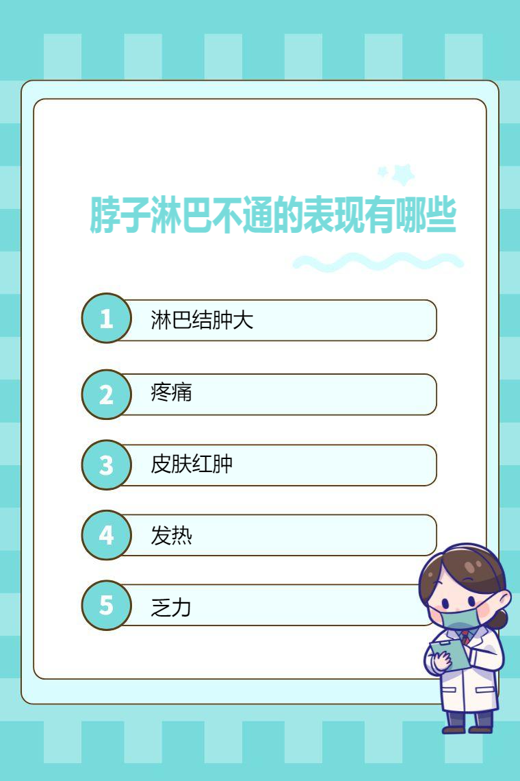 脖子淋巴不通的表现有淋巴结肿大、疼痛、皮肤红肿、发热、乏力等。