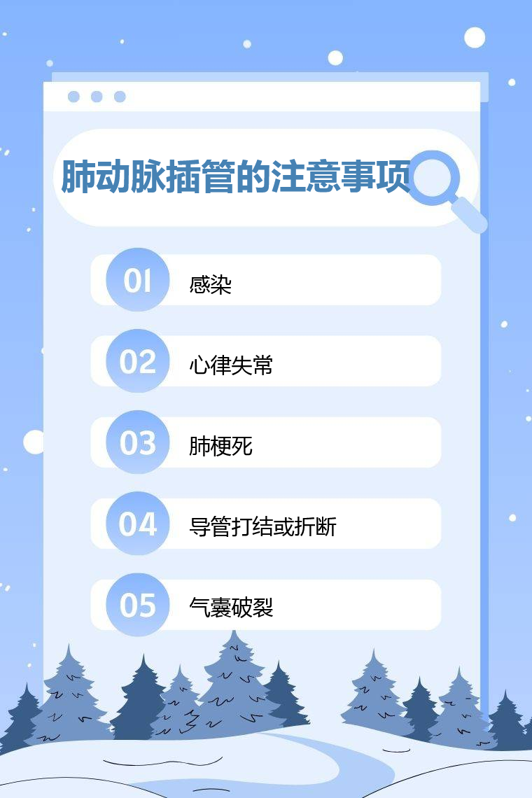 肺动脉插管是一项有创操作,需要注意感染、心律失常、肺梗死、导管打结或折断、气囊破裂等。