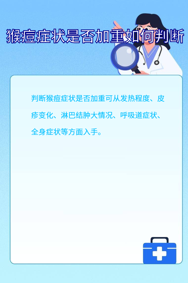 判断猴痘症状是否加重可从发热程度、皮疹变化、淋巴结肿大情况、呼吸道症状、全身症状等方面入手。
